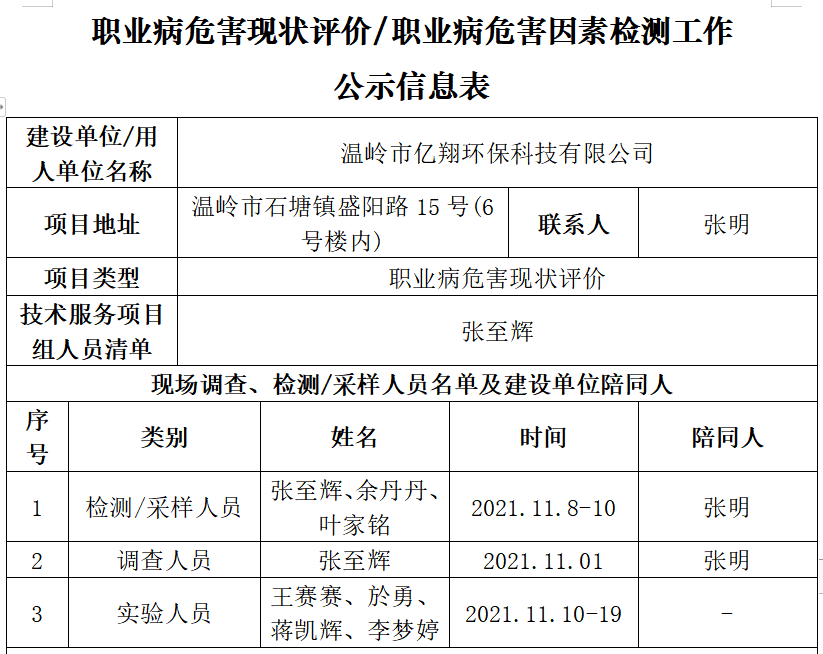 温岭市亿翔环保科技有限公司职业病危害现状评价公示