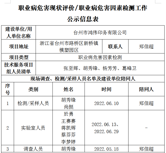 台州市鸿伟印务有限公司职业病危害因素检测公示